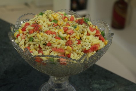 Place the macaroni, corn, tomatoes, carrots and capsicum in a bowl. Mix together the olive oil, vinegar, salt and peppercorns in a separate bowl.
