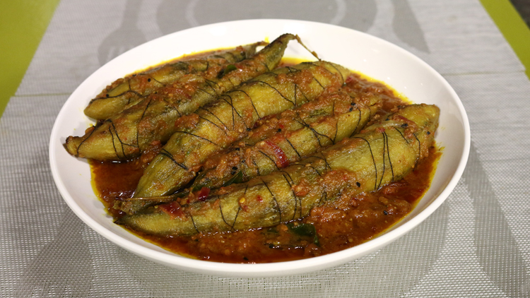 - Now heat oil in a frying pan and fry the spice-filled bitter gourds.