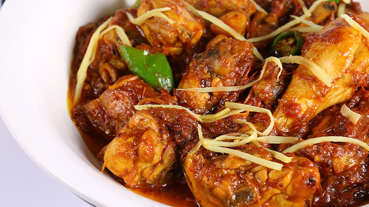 In a pan heat oil and chicken fry for 15 minutes then remove and keep a side. Now onion adds and fry 5 minutes. Then ginger and garlic fry 1 minute. After this tomato, crushed red chili, turmeric and salt mix and fry 1 minute and cook on low heat for 10 minutes. Then green chili and ginger fry for a minute and mix in chicken then serve it.