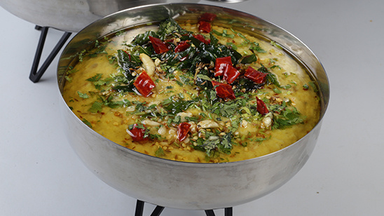 Soak all the daals for 1 hour, boil all the daals together in pressure cooker with ½ tsp turmeric and 1 tsp salt for 15 mins, once the daal is tender keep aside. Heat a pan add mustard seeds, cumin seeds and heing, add bay leaf, black cardamom, green cardamom, anistar, cloves and green chilies, then add ginger garlic paste, cook for 1 min, add sliced onion, and fry till light golden, once done add the tomatoes and all the dry spices with ½ cup water, cook for 5 mins, add the cooked daal, simmer for 10 mins, remove garnished with coriander leaves, serve with tomato, onion, cucumber, raita and chapatti.