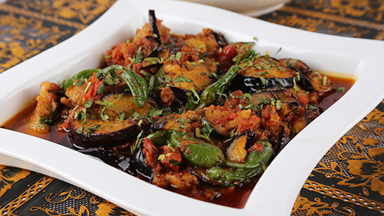 Cut thick pieces of eggplant and deep fry them. Now boil tomatoes, blend them and make them thick by cooking. Then heat oil and fry mustard seeds and fenugreek seeds. Then add whole red chili and fry it then add crushed garlic and fry. Now add white cumin, tomato, salt, red chili powder and turmeric then saute gravy well. Now add fry eggplant, whole green chilies, curry leaves and tamarind pulp and let it simmer. Then take out in dish and garnish with green coriander.