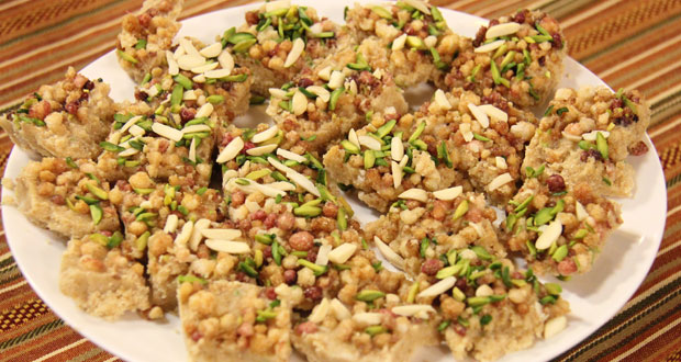 - Remove in a grease platter and sprinkle with fried gond, almonds and pistachio.