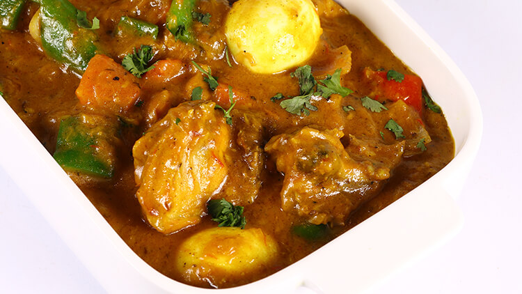Whole chicken wash and cut in to 8 pieces .now tomato, capcicum and onion cut in to small cubes in a bowl add garlic paste ,black pepper powder ,few saffron, yogurt , salt mix and make paste then apply on half chicken and leave for half an hour keep in refrigerator after this non in stick pan heat oil and fry ginger garlic paste then fried onion ,turmeric ,red chili powder ,green chili ,coriander powder and some water add and cook and roast masala well .now yogurt and masala marinated chicken add and fry after 5 minutes .add 1 glass water when water boil then flame slow and cook 20 to 25 minutes .finally black cumin ,all spices powder, Egg (boiled)and chopped vegetables add .now in slow flame cook for 10 minutes then dish out and garnish with green coriander and serve with chapatti.