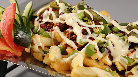 In a serving platter arrange French fries fried, top with chicken mince, then beans mixture with sauce, top with capsicum, jalapeno, jerkins, drizzle with cheese sauce, serve immediately.