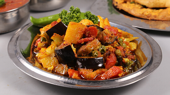Boil tomatoes and blend. Now fry potato, Cauliflower, Carrots, Eggplant and Green Peas in oil. After it in another pan heat oil add tomatoes paste with garlic, Turmeric, Red Chili Powder, Salt, Yogurt, Cumin Seeds and Mustard Seeds to cook for 1 minute. Now in this add fry veggies and give dum for 20 minutes.
