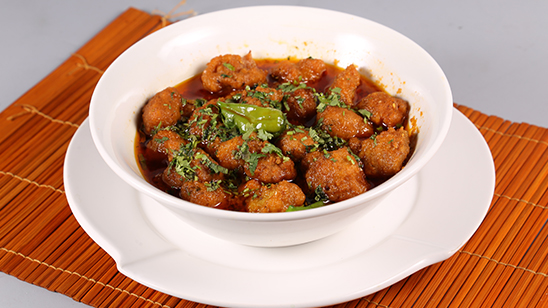 Soak both lentils for 2 to 3 hour and ground coarsely. Add remaining ingredients and leave for half hour. Fry like small fritters. For masala heat oil add fenugreek seeds fry well. Add ground onion, ginger garlic paste, salt, chili, turmeric, fenugreek and ground coriander cook well. Add yogurt cook well. When masala done add water for shorba. Cook till boil comes. Add fried mangochian in it and cook for 15 minute. Garnish with green coriander and all spice powder.