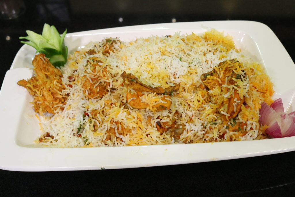 - Remaining fried onion, remaining rice on top to cover the masala, then add chicken on top of it, drizzle about ¼ cup oil, soaked saffron, orange color.