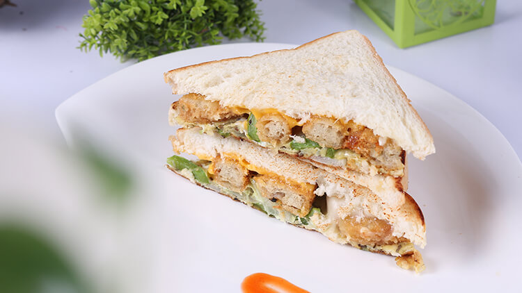 In a pan heat oil and fry nuggets and set a side .now in a bowl add salt and black pepper mix .then in a pan add 3 tbsp oil and fry vegetables ,eggs and nuggets then covered and cook for 5 minutes .now place the bread slices and place omelet then cheese slices and then place the other slices .finally cut in to 2 pieces and serve .