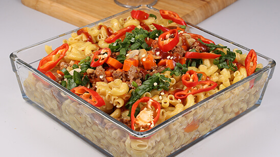 Heat 3 tbsp oil in pan, add 1 tsp chopped garlic and fry well. Now add 1 tsp chopped ginger with 250 gm Boiled beef mince and fry well. Add 1 cup mushrooms and 2 chopped carrots, fry for 1 minute. Now add 1 cup stock, 3 tbsp soya sauce, ½ cup tomato ketchup, 1 tsp sesame oil, ½ tsp salt, 1 tsp crushed red pepper and 1 tbsp vinegar. Thickens the mixture with 1 tbsp corn flour mixed in 2 tbsp water. Lastly add 1 packet boiled pasta and serve.