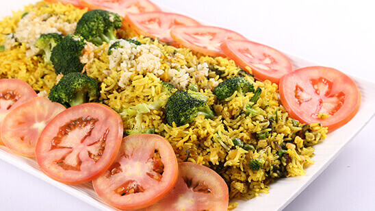 In a pan heat oil, add rice, lentils, turmeric and water and cook khichri till done. Fold in the peas and broccoli at the end. In a saucepan, add the cleaned spinach leaves and cook for a minute or two covered till spinach wilts and then immediately drain it in a colander and transfer it into a bowl of cold water. Once cool blend it to a paste and set aside. Heat oil and add bay leaf, cumin seeds, chopped garlic, green chillies, chopped onions and saute until the onions have started to change colour. Add the pureed spinach and mix. Lower the flame, add the cooled khichri and mix until combined. Add all spice powder and salt. Heat ghee or oil, add sliced garlic and fry till golden, pour this onto the khichdi. Garnish with sliced tomatoes and serve with the phool makhana kadhi.