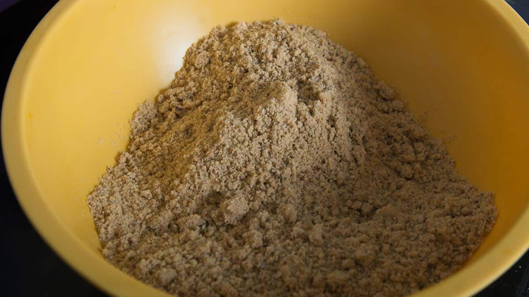 - Once the flour mixture is cooled, add powdered sugar, dry ginger powder and ground dry fruits.