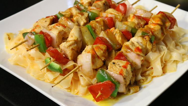 - Assemble skewers on top of pasta and serve.