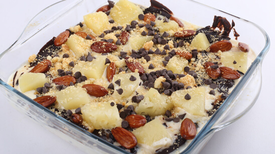 First cook milk on a stove. Once it is boiled add corn flour and cook well until the mixture gets thick. Then remove it from the stove. Now add condensed milk and cream cheese. Mix well. Then divide the mixture into 2 sections. Now on double boiler melt chocolate and cream together until smooth. Then add this mixture into one of the sections of cream cheese. Then in the second section add fried almonds and mix well. Now in the serving dish give layer of cake rusk. Then add chocolate mixture and then add almond mixture. Now add pineapples. Lastly add chocolate chips and serve chilled.