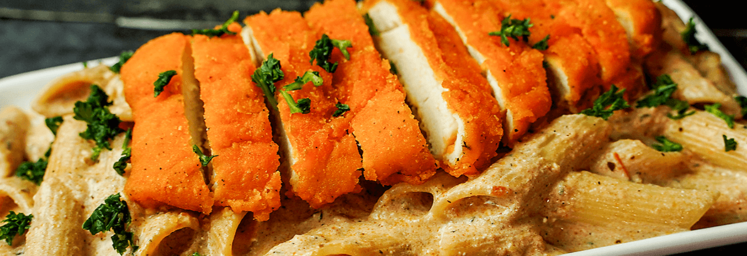 Dish out pasta in a serving bowl and place Thunder Fillet strips. Pink Sauce Pasta is ready.