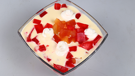 Boil 1 ½ cup water and add in 2 packets of strawberry jelly, mix, set in a plate, cut in a small cubes and keep aside. Drain the liquid from the food cocktail, beat cream cheese in a bowl till light and smooth, add prepared chilled custard, condensed milk, tetra pack cream, beat until smooth.