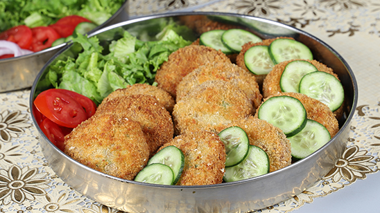 First heat butter in a pan and add the threaded chicken, all spices, green chili, tartaric, turmeric and green coriander. Mix them and smoke it with coal and set it room temperature. Then add and mix the boiled and mashed potatoes to make cutlets. Then dip them in the whipped eggs and breadcrumbs to fry them. Serve it with cucumber, tomatoes and lettuce leaf.