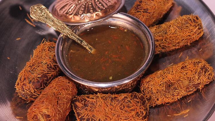 Mix boiled potatoes with fried onion. Add chopped green chilies and chopped coriander mix well. Form into kabab coat with egg then crushed vermicelli. Fry in hot oil. Remove and serve.