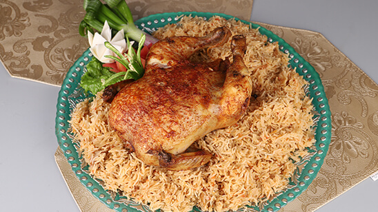 Marinate chicken with vinegar, chat masala, salt, garlic, red chili powder and oil, and refrigerate overnight. Now bake it for 40 mins on 200 D. Now in required oil, fry onion till golden brown. Now add black cumin, tomato, whole black pepper, salt and bay leaves and mix well, add 2 glasses of water, plums, green chili paste, then add soaked rice in it. As the water gets dry, add chicken, cover and leave it for half an hour. Delicious sajji pulao is ready to serve.