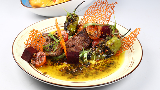 Apply salt, black pepper, chopped garlic and oil on beef and marinate well. Cook on medium flame. For sauce heat butter in pan then add garlic, lemon juice, parsley, salt, black pepper and green chilies mix well. Remove in platter add chickpea puree, beet root cubes, cherry tomatoes and micro green, serve.