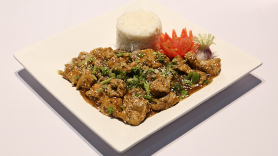 In chicken except oil and sesame seeds all ingredients mix and leave for some time .then fry .now for sauce heat oil and fry garlic .then add vinegar ,black pepper ,soya sauce and brown sugar add and mix .now chicken stock and corn flour add and thick .then add 2 tbsp oil ,capsicums and broccoli sauté on high flame after this fried chicken and sauté vegetables mix .finally dish out and then garnish with onion and sesame seeds and serve with steam rice .