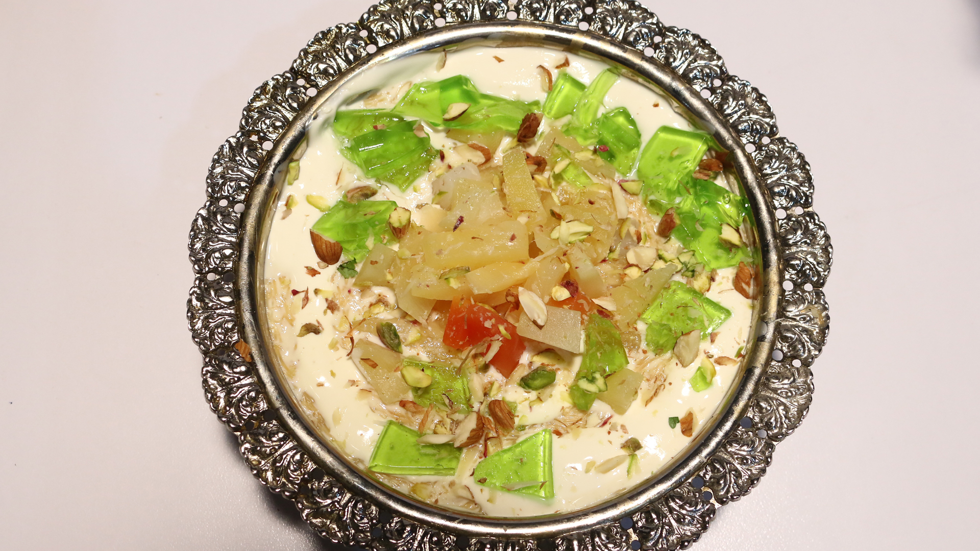 Firstly, milk boil in a pot. Now broke the vermicelli. When it’s come to 1 or 2 boils then add sugar when milk thick then stove off and add vanilla essence. then cool it and dish out. Finally add cream, ready jelly, fruit cocktail and garnish with chopped almond and pistachios then serve.