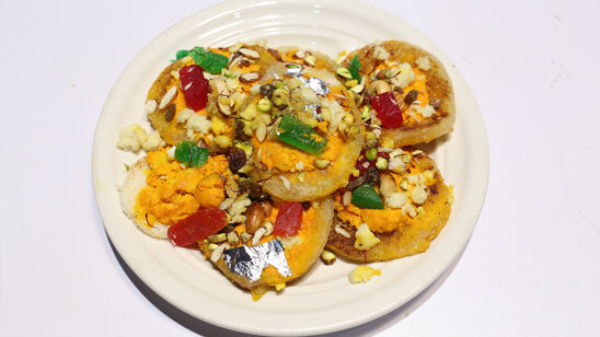 In water add sugar, saffron and yellow color and make sugar syrup then turn off the flame. Now cook whole dried milk in milk. When it gets dissolved then turn off the flame. Now put bread slices in a thaal then pour sugar syrup over it. Then spread whole dried milk and milk over it. Then put dry fruit, ashrafiyan and sterling silver leaves on it.