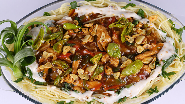 Heat oil then add ginger garlic paste and saute chicken in it. Then add vegetables and saute. Add salt, black pepper, sugar, crushed red chilies, sauces with ½ cup water and corn flour and let it thick. Mix mayonnaise, vinegar and red chilies. Assemble rice, noodles, mayo sauce, vegetable sauce add fry garlic and green chilies on top and serve.
