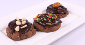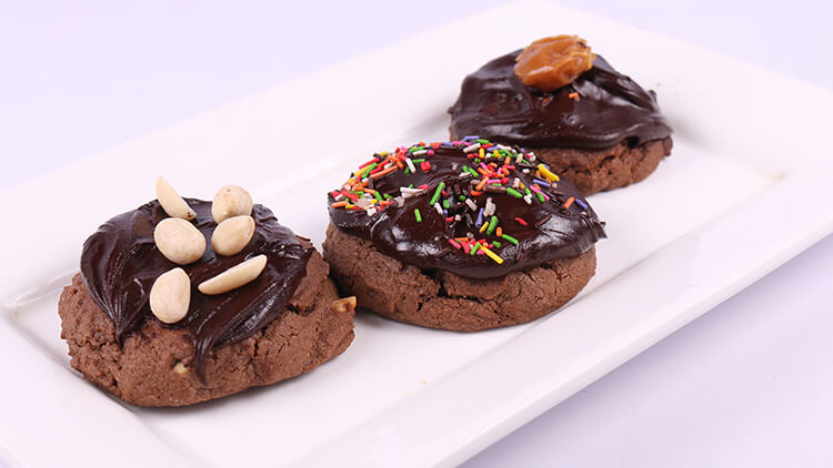 Beat butter; add brown sugar and peanut butter until creamy. Add eggs and vanilla essence. Add flour, cocoa and baking powder and beat until well mixed. Divide the dough in half. Place each half on a sheet of plastic wrap and form into a log. Wrap well and chill until firm, 4 hours or overnight. Working with one dough log at a time, cut slices 1/4” thick and place 2” apart on baking sheet. Bake at 180 degrees C for 8-10 minutes, or just until they lose their glossy sheen. Cool on cookie sheets 10 minutes then remove to a rack to cool completely. Once cookies are cool, melt chopped chocolate and oil or butter until chocolate is melted and smooth. Dip each cookie in the melted chocolate, and then dip in the toppings. Or drizzle the melted chocolate form a piping bag onto the cookies and sprinkle with toppings.