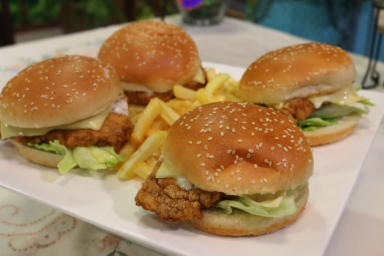- Put mayo on bun spread with iceberg chicken fillet, cheese slice, iceberg, and cover with bun serve with fries.