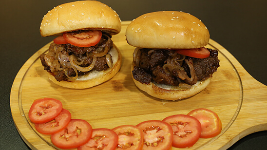 Mix garlic, corn flour, salt, black pepper and orange juice and leave for marinate for 30 minute then fry well. Heat oil add ginger, vegetables, brown sugar, soya sauce, rice vinegar, red chili flakes and sweet chili sauce cook. Coat fry beef in sauce well. For sticky onion heat oil add onion, brown sugar, salt and paprika sauté well. Put beef, onion and tomato on burger bun.