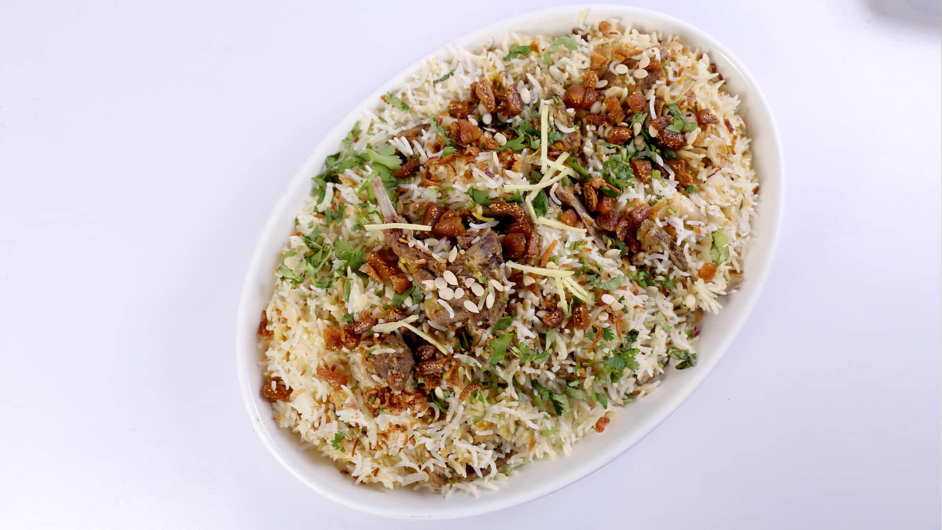 In mutton put all ingredients except almond powder and whole dried milk and leave for 5-6 hours. Now fry onion in clarified butter then take out and crush half of the onion. In same clarified butter add marinated meat and cook. When it get tender then saute and add almond powder and whole dried milk. Now in another pan add mix all spice, milk, finely cut ginger and salt in water and let it boil. Then add rice in it and cook till one thread left. Add crushed fry onion and saffron on cooked meat. Then add rice and ½ cup clarified butter over it. Now add finely cut figs and mix melon seeds. When it’s get done then take out in dish and garnish with green coriander and fry onion.