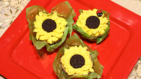 Apply little frosting in the center of the cupcake. Place chocolate cookie on top. Now using yellow butter cream frosting filled in a piping bag and use leaf nozzle, make petals to complete sunflower. Repeat this for all cupcakes. Fix cupcakes in prepared basket/bucket with green tissue attached.