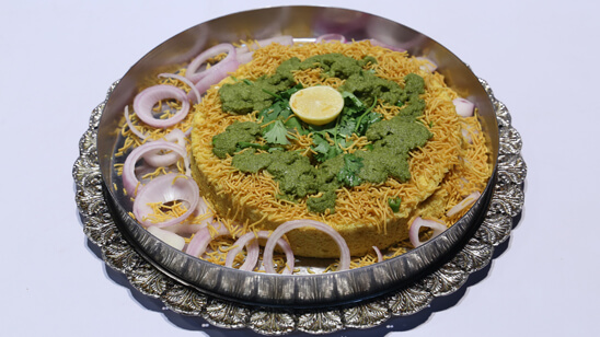 Clean the split gram and split black gram. Wash thoroughly and soak in water separately for 5-6 hours. Strain any remaining water from the soaked lentils. Wash flattened rice in water before using. Coarsely grind the split gram after removing the water as required. Remove the ground lentils into a big bowl. Finely grind the split black gram. Add the soaked flattened rice into it as well and grind finely. Take out the split black gram and flattened rice mixture and add it to the same bowl as the split gram. Mix all ingredients really well. Add ginger, turmeric powder, green chili, salt and half the amount of red chili powder. Mix all ingredients. Also add 2 tsp oil to the batter. If the batter appears to be thick, add 2-3 tbsp water to it. For making the Surtilocho, take a steamer and fill with water and let come to a boil. Lastly add the fruit salt to the batter and mix. Immediately pour the mixture in the greased tin or container. Tap the tin so that the mixture inside spreads out evenly. Sprinkle red chilli and black pepper on the top. Place the batter-filled container in the steamer and cook the Surtilocho for 20 minutes in the steam. Surtilocho appears to be puffy once cooked. Insert a knife, if the batter doesn’t stick to knife then it is ready. Take out piping hot surtilocho onto a plate with the help of a spoon, serve green chutney on the side and sprinkle chopped coriander, green chilies chopped and juice of lemon, lastly sprinkle sev and serve immediately.