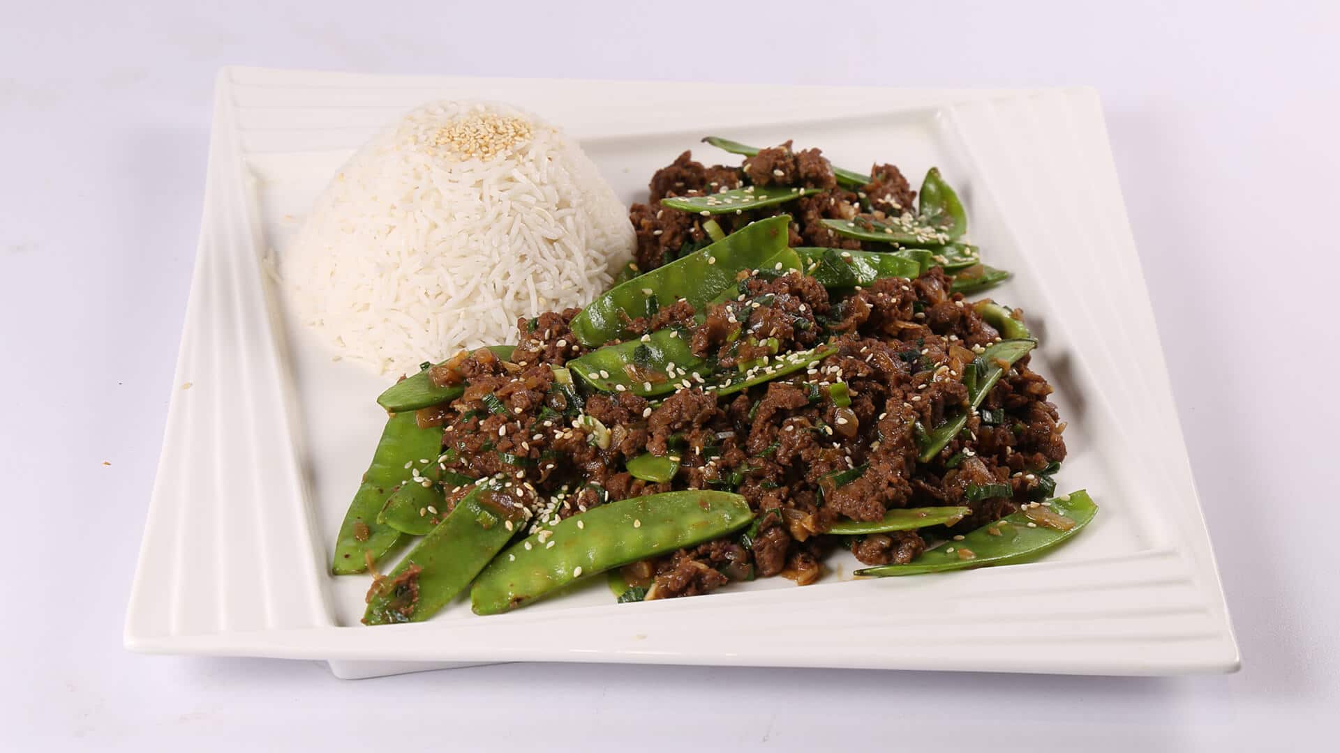 Heat oil. Add brown onion and garlic. Cook, then add mince. Cook until browned then add flour. Add teriyaki sauce, vinegar, sesame oil and sugar. Cook until sauce thickens. Add snow peas and green onion. Cook for 2 minutes or until snow peas are tender. Sprinkle with sesame seeds. Serve with rice.