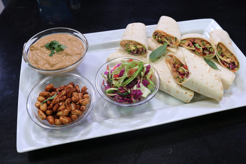- Divide tuna salad and slaw amongst each tortilla. Top with roughly chopped peanuts and serve with peanut dipping sauce.