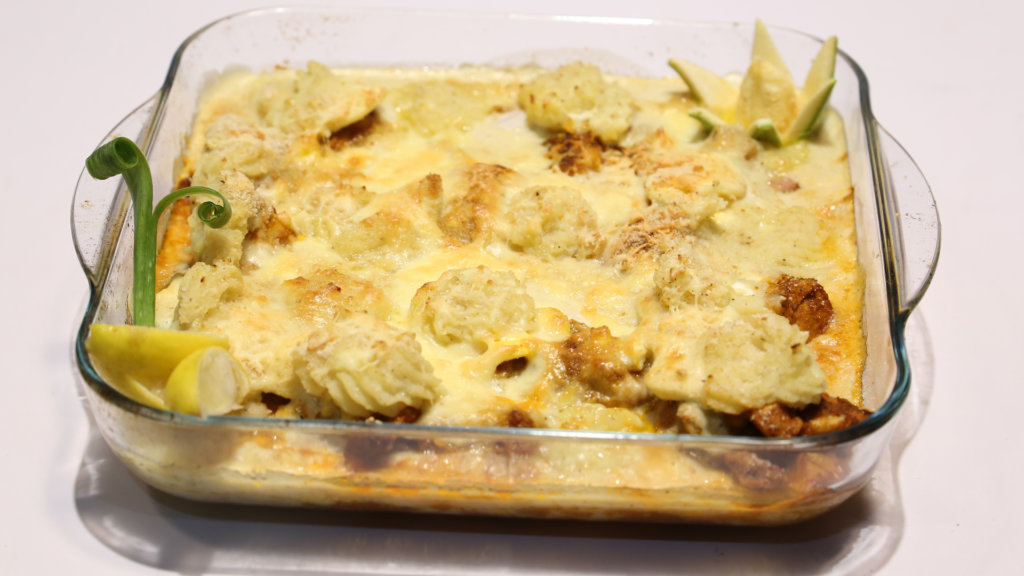 • To assemble grease a pyrex dish, pour the chicken mixture, arrange with boiled egg slices, top with white sauce and decorate it with mashed potatoes.